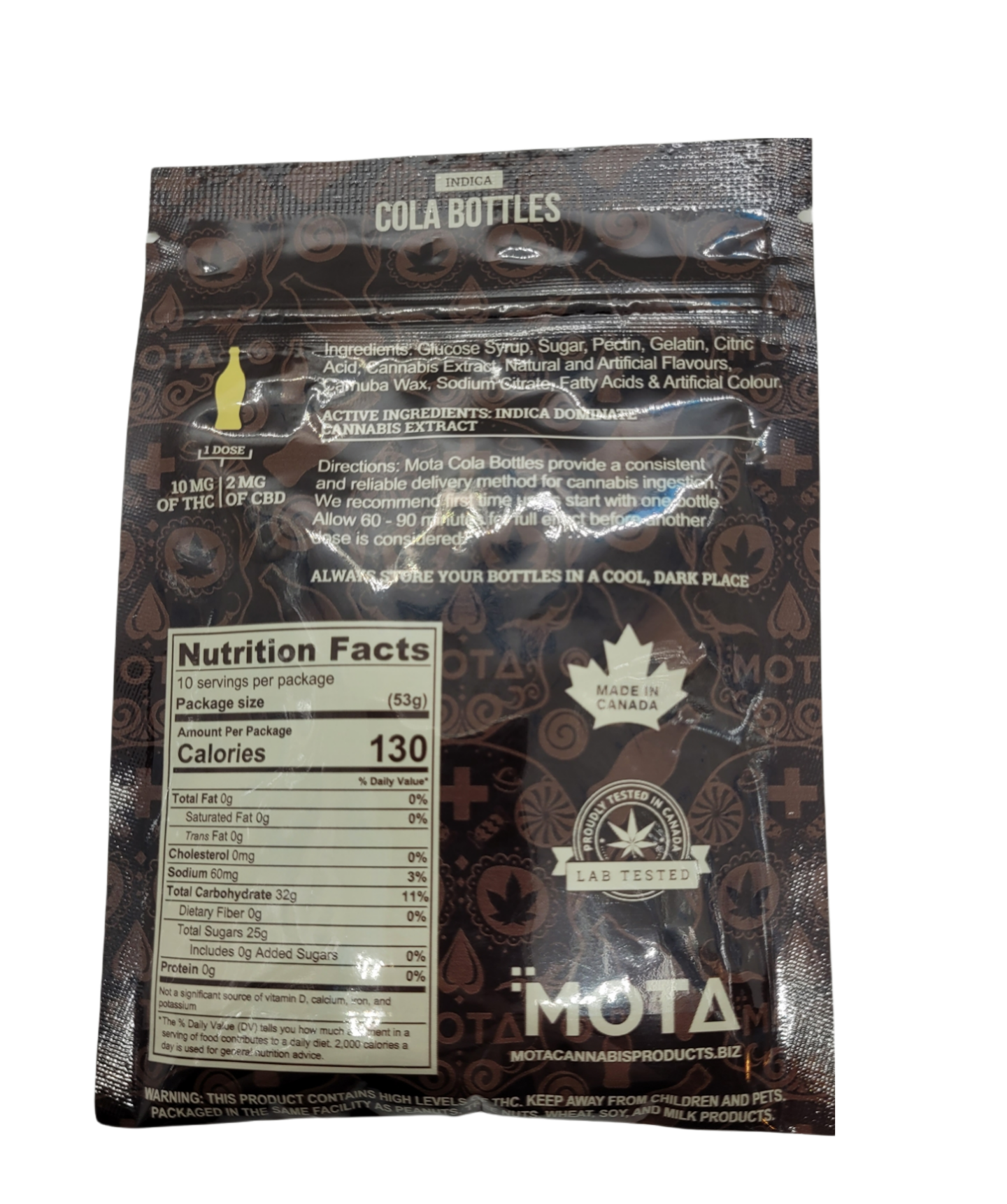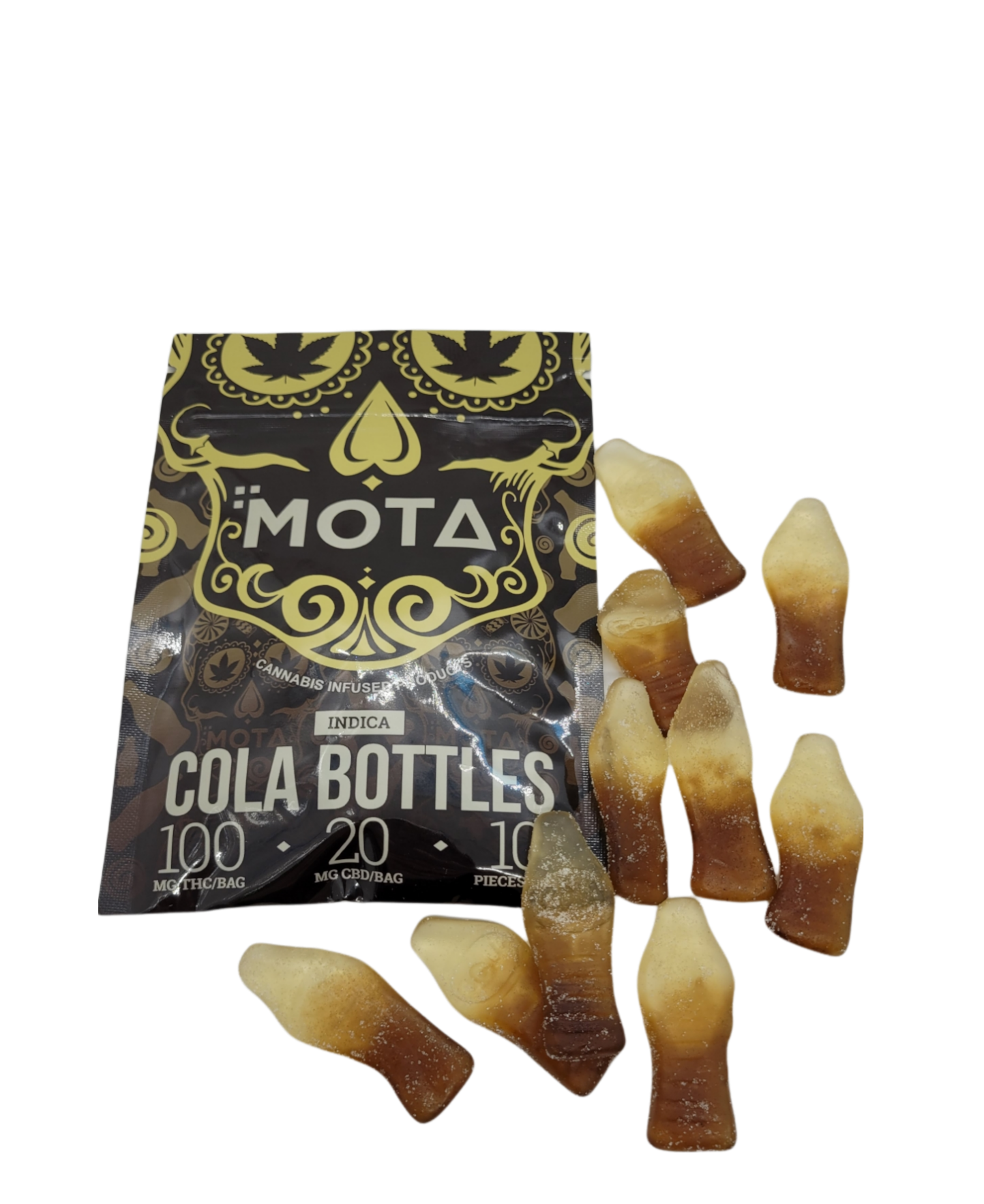 100 MG of THC / 20 MG of CBD. Each bag contains 10 cola bottles.